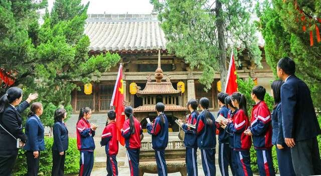图③ 2026年4月13日,夏县司马光祠景区内,大鹏学校师生在参观余庆寺大佛殿古建筑。